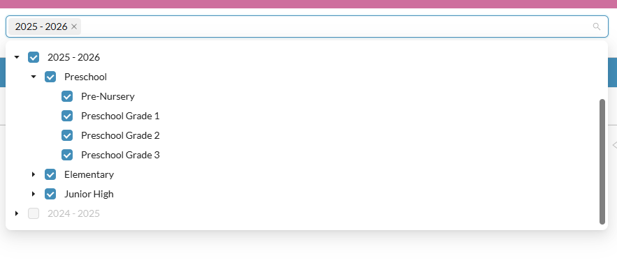 - Al seleccionar un ciclo escolar o año lectivo, se marcarán por defecto todos los niveles y grados relacionados.