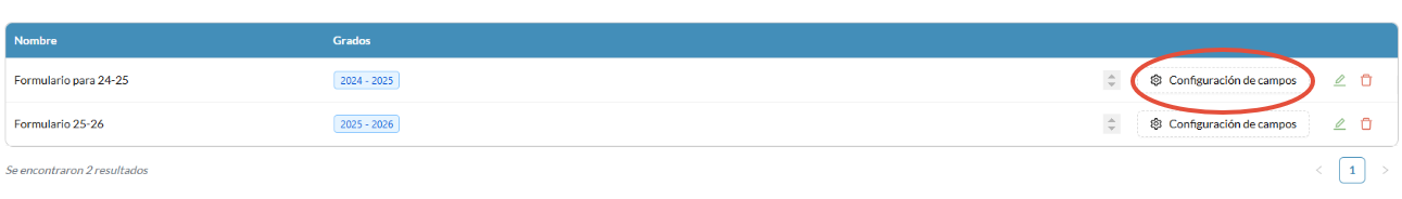 - Una vez creada la configuración, haz clic en el botón "Configuración de campos" correspondiente al formulario creado.