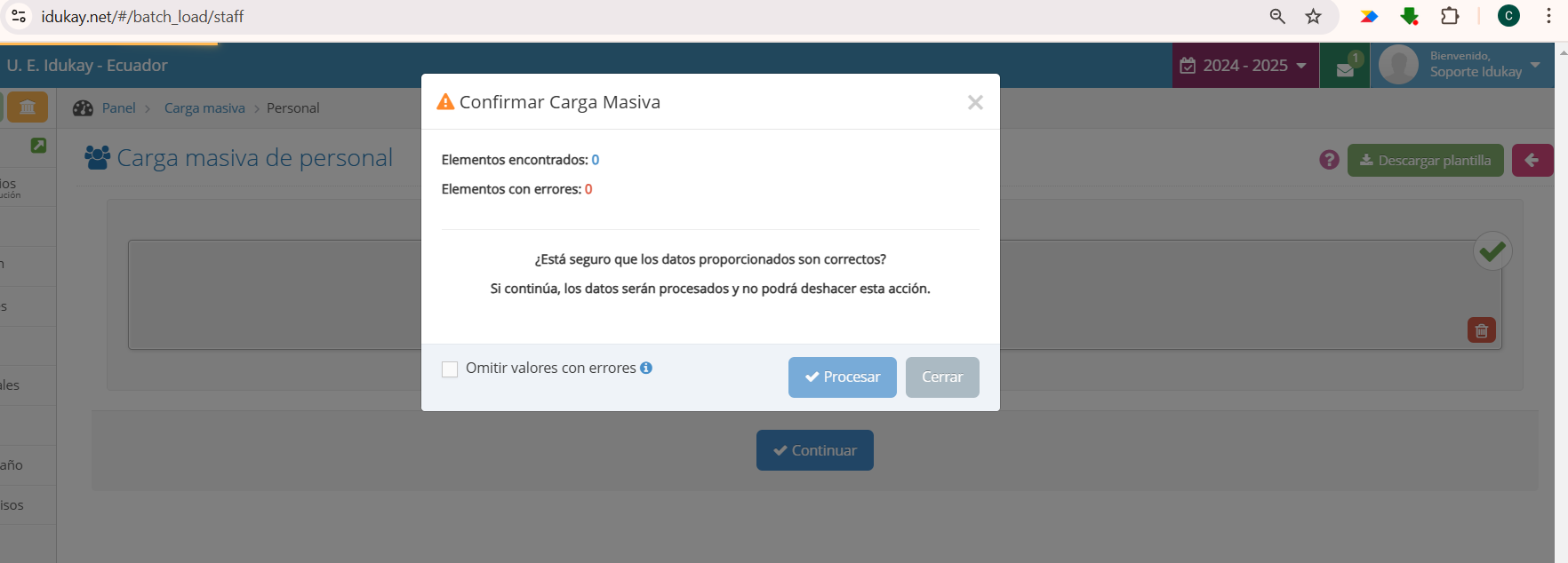 Haz clic en Aceptar y luego en Continuar. Si no hay errores, el sistema cargará la información del personal docente y el proceso habrá finalizado con éxito.