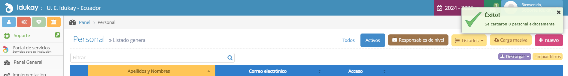 Gracias a la funcionalidad de carga masiva de personal en Idukay, el proceso de actualización de información docente y administrativo es más rápido y eficaz. Siguiendo los pasos descritos, podrás garantizar que la información sea procesada sin errores. Para cualquier duda adicional, consulta los recursos disponibles o contacta al soporte.
