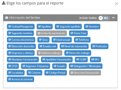 3. Al darle click al botón “exportar excel”, saldrá una pantalla emergente que nos dará las opciones que necesitamos descargar de la base de datos de familiares, podemos seleccionar o quitar algún apartado solo dándole click, sabremos que no está seleccionado porque se pone de color gris, una vez terminado, solo debemos apretar el botón de exportar y bajará un excel.