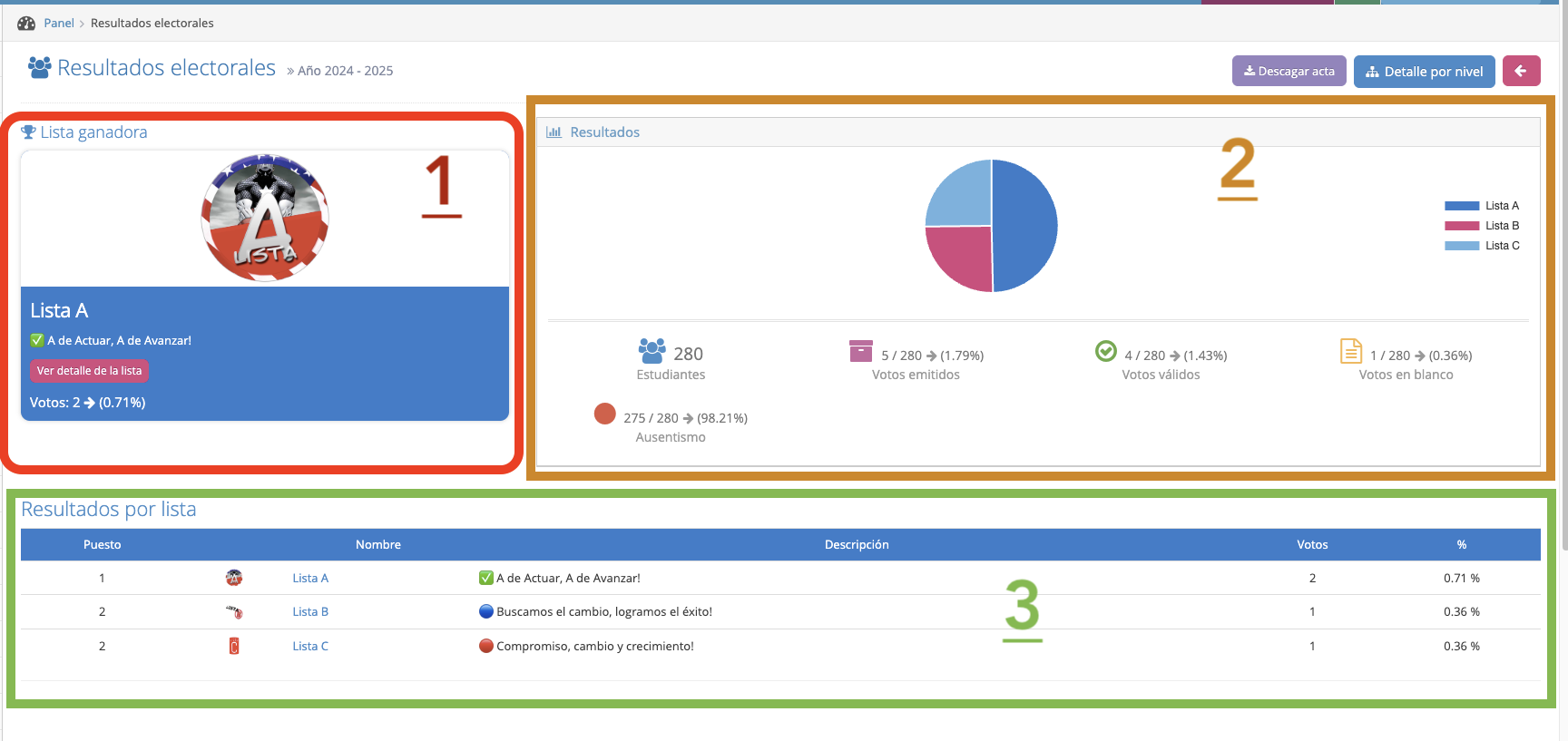 Al ingresar a la sección de votaciones, se mostrará la pantalla de resultados electorales, organizada en tres secciones principales: