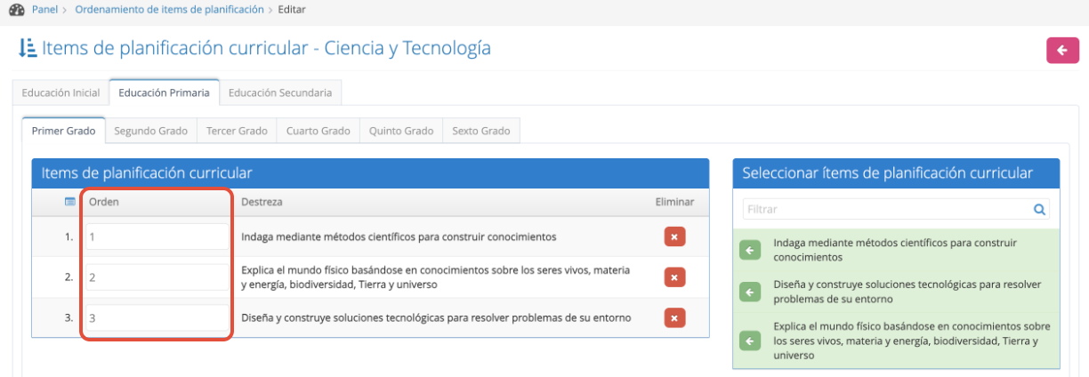 Puedes ordenar las competencias por nivel (Educación Inicial, Educación Primaria y Educación Secundaria) y se debe realizar el ordenamiento manualmente en la pestaña de cada grado que aplique.