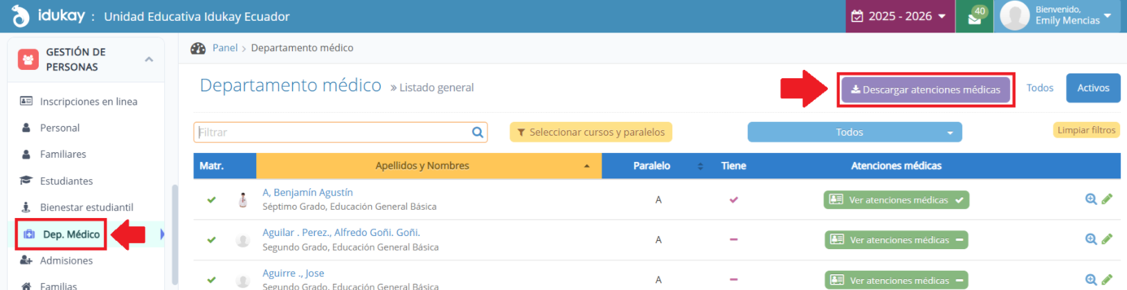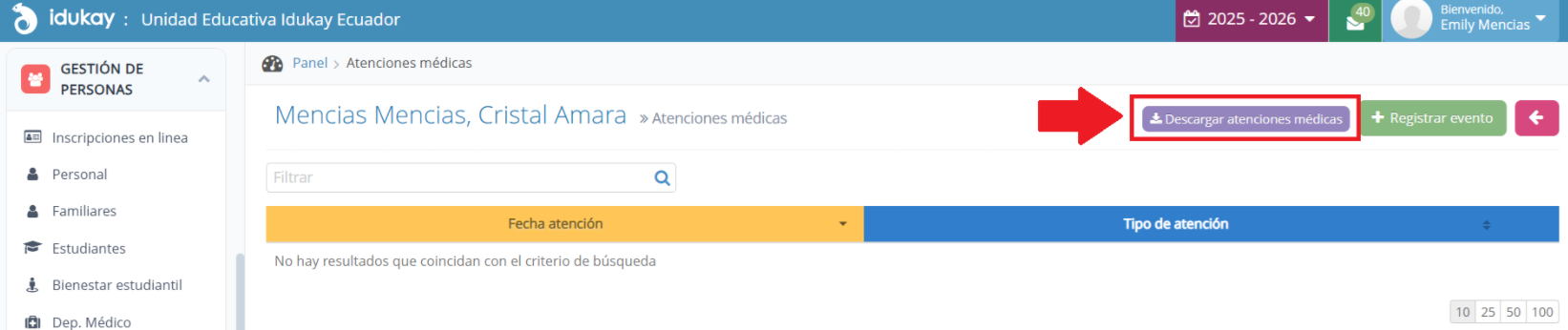 En el caso de requerir un reporte de las atenciones brindadas a toda la institución en la pantalla principal al ingresar al departamento médico, presionamos en la parte superior derecha el botón de color morado "Descargar atenciones médicas"