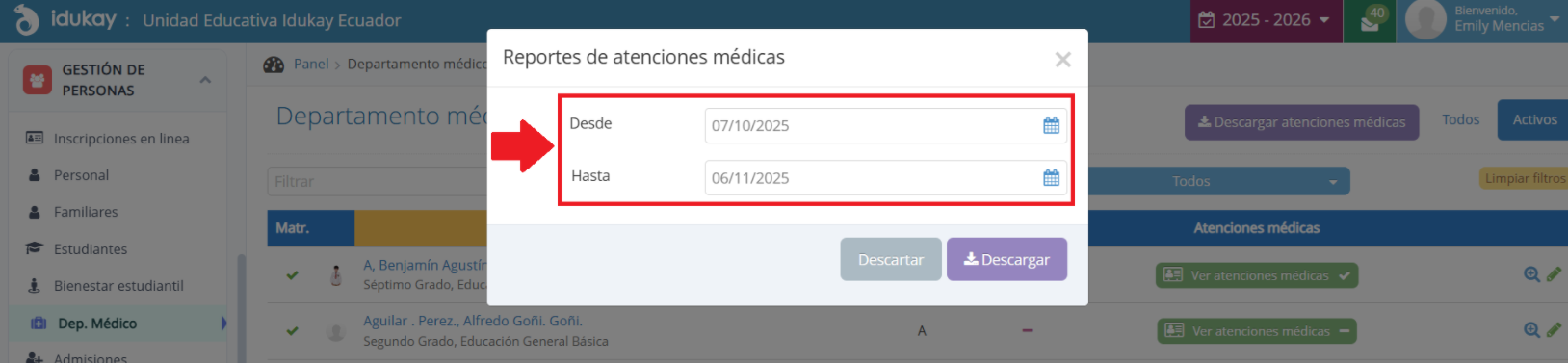Presionamos Descargar atenciones médicas y registramos fecha de inicio y fin para extrer la información solo de ese estudiante