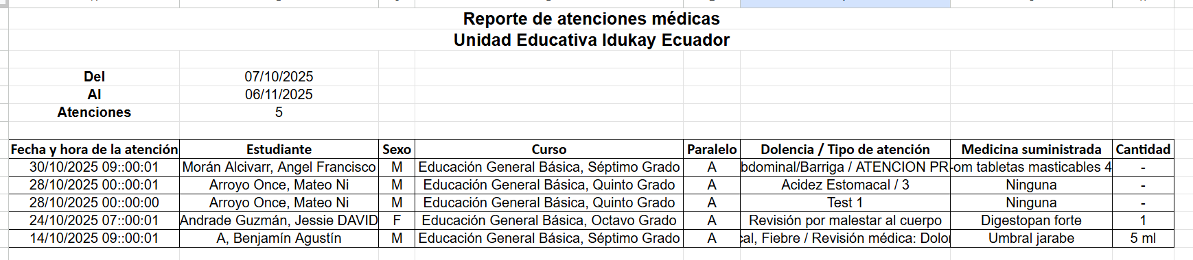 Se descarga un excel con la siguiente información: Fecha y hora de la atención, Estudiante, Sexo, Curso, Paralelo, Dolencia / Tipo de atención, Medicina suministrada, Cantidad