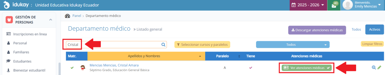 Filtramos por el nombre del estudiante e ingresamos al botón de color verde "Ver atenciones médicas"