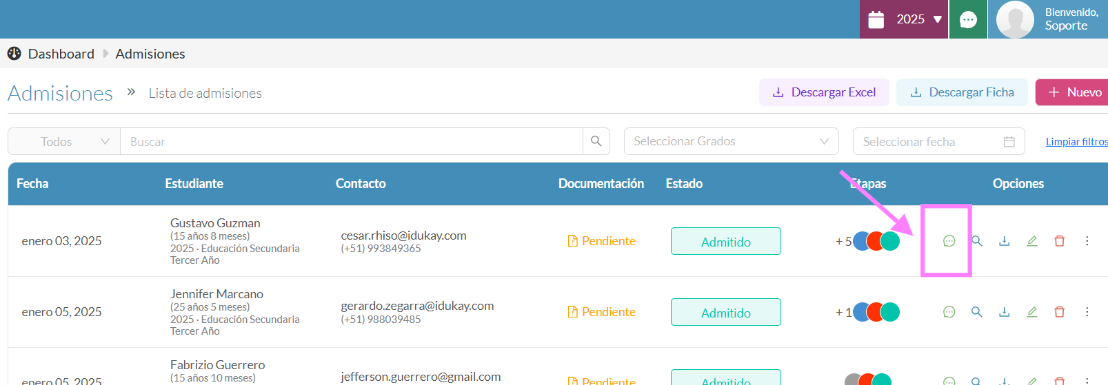 - Al lado izquierdo de cada postulante encontraremos varios íconos, hacemos clic en la burbuja de diálogo: Conversación.