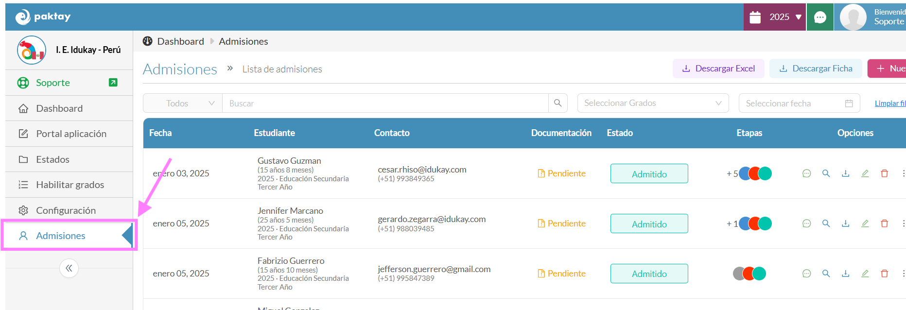 Dentro de Paktay nos ubicamos dentro del módulo Admisiones en el lado izquierdo.