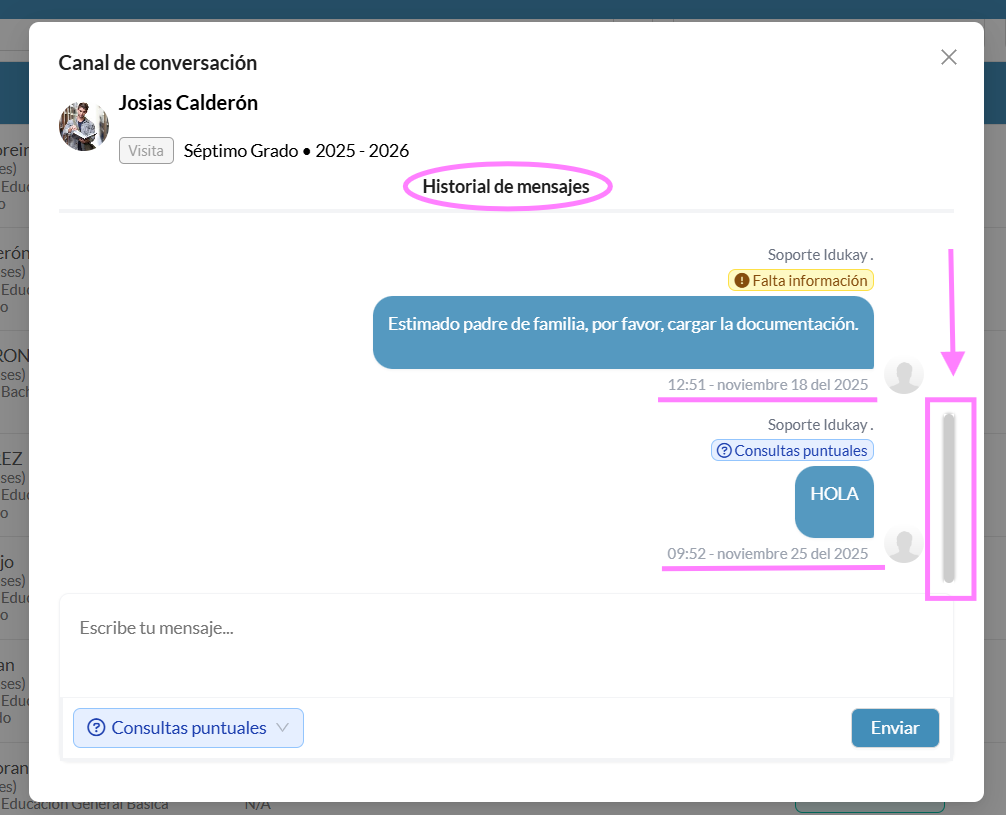 Dentro de la ventana emergente también podrás revisar el HISTORIAL DE LOS MENSAJES ENVIADOS DURANTE EL PROCESO DE POSTULACIÓN, identificando fechas y horas de los envíos y el tema del mensaje.