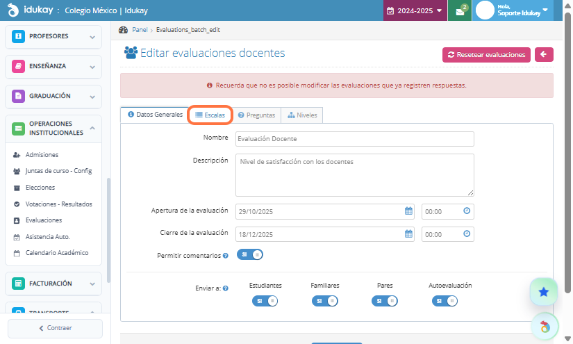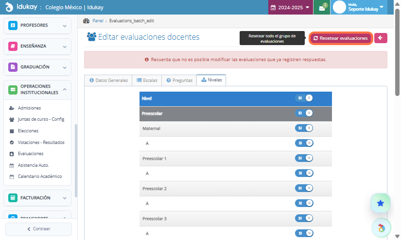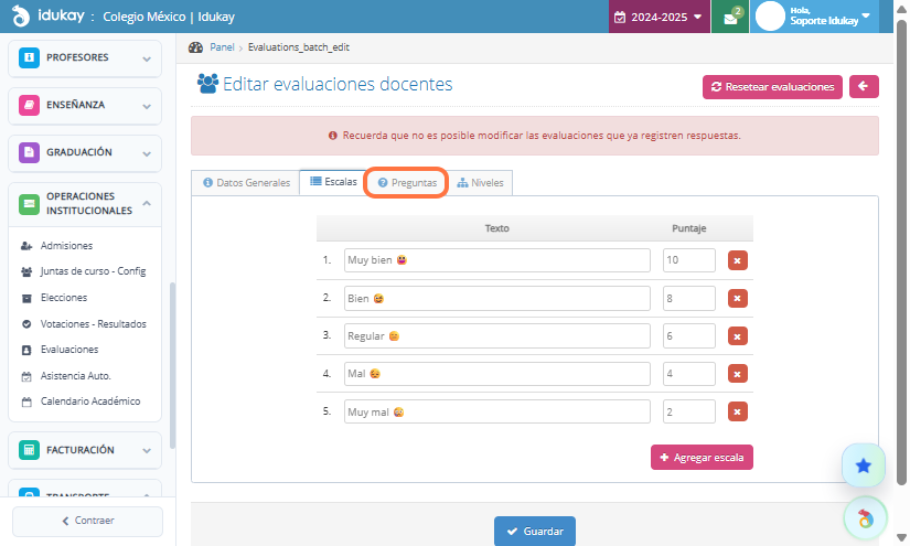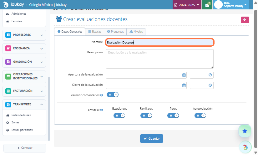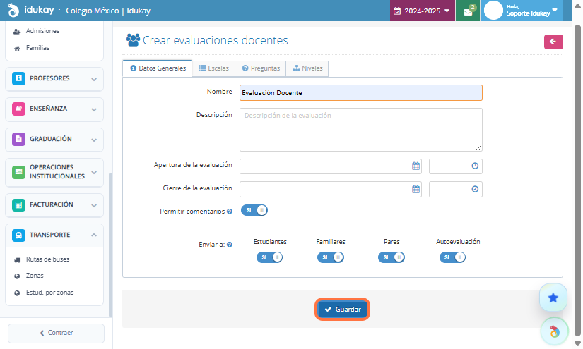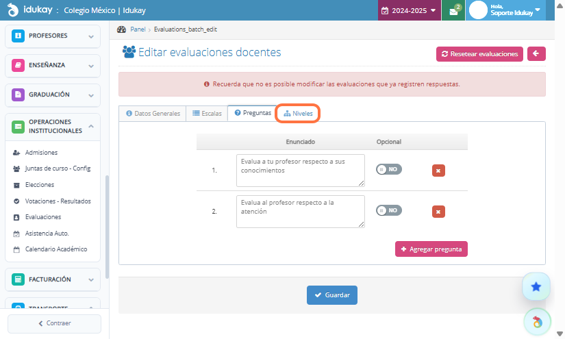 Finalmente selecciona los niveles y da clic en Guardar, se va a generar una Evaluación por cada clase