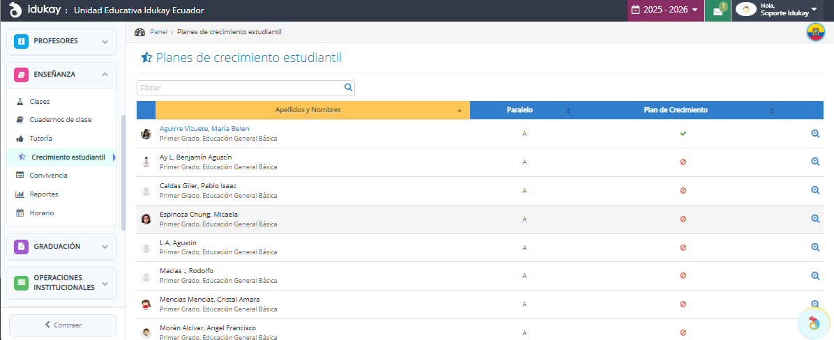 Una vez cumpliendo con esta condición en el menú Enseñanza se habilitará el módulo Crecimiento estudiantil