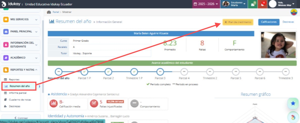 En el menú Reportes y Notas, debes dirigirte al módulo llamado: Resumen de Año, en la parte superior izquierda vas a encontrar el apartado de nombre: Plan de Crecimiento.